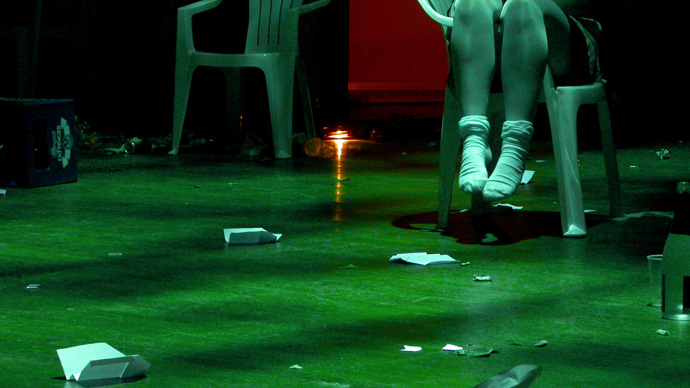 "Dass das Leben junger Leute nicht nur lustig ist, zeigt die Bühne, die der Regisseur Ines Alda und Nikolaus Frinke bauen ließ. Auf dem Weg zu den weißen Plastikstühlen, tappt man zwischen zwei transportablen WC-Häuschen vorbei über einen Holzboden, der mit leeren Dosen, Plastikbechern übersät ist.